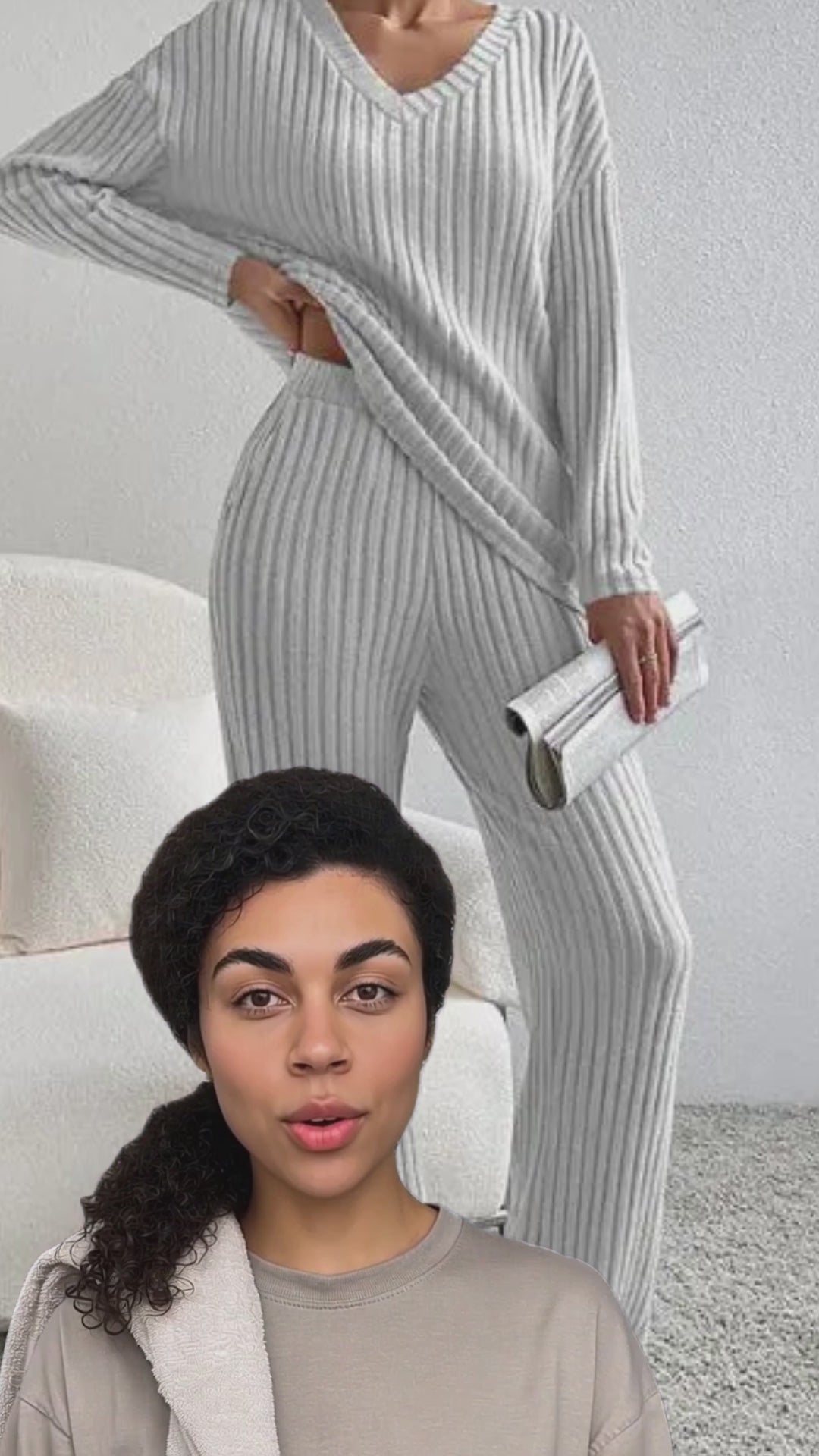 Stay cozy and stylish with our Women’s Autumn Ribbed Knit Lounge Set. Designed for ultimate comfort and relaxed style, this 2-piece outfit features a soft ribbed knit fabric that keeps you warm during chilly autumn nights. The set includes a flattering V-neck long sleeve sweater and matching long pants, making it perfect for lounging at home, sleepwear, or casual day-to-day outfits. Whether you're unwinding on the couch or enjoying a casual outing, this versatile set provides both warmth and a chic look.